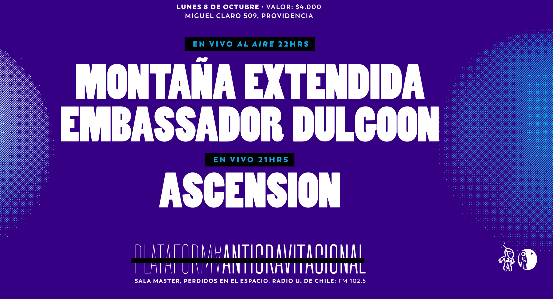 22hrs. abrimos el programa con Embassador Dulgoon Nicolas Carcavilla, composiciones electrónicas que articulan misteriosas melodÃas cinemáticas, las que despliegan extensos paisajes de ciencia ficción, para luego cerrar el programa con la performance sonora del músico y artista visual Rodrigo Araya con su proyecto Montaña Extendida quien, a través de objetos y contactos eléctricos, realizará un sistema de instalaciones improvisadas en tiempo real, generando fenómenos acústicos y electroacústicos.