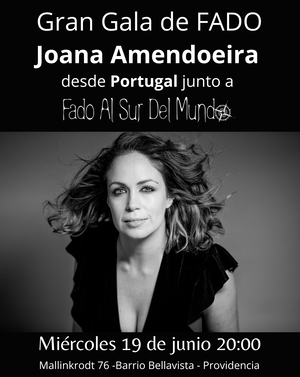 Con más de 25 años de consolidada trayectoria la gran Joana Amendoeira será la invitada de honor para la Gala que iniciará la celebración de los 10 años de trayectoria de Fado al sur del Mundo, agrupación chilena precursora de este estilo en Chile.