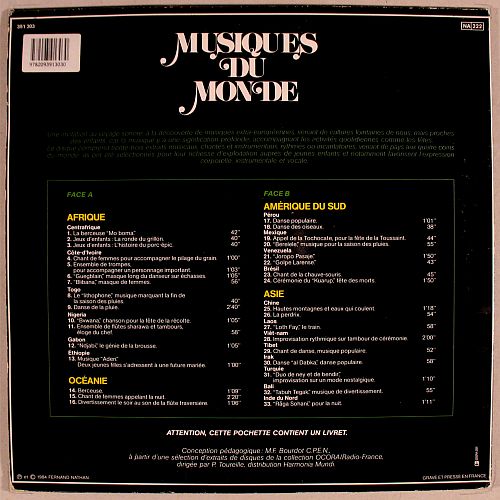Un aporte de LuÃs Emilio Briceño, amigo cineasta radicado en Paris, que en paralelo a su arte se dedica a coleccionar y armar compilados con música que va recopilando en sus viajes y escudriñando sucuchos perdidos en las vecindades. Aquà nos comparte un disco de su colección: Musiques du Monde, disco editado con fines pedagógicos y que muestra una pincelada con sonoridades (33 en total) de diversas partes del mundo, cantos ceremoniales, juegos o danzas populares. Hemos seleccionado unos tracks del centro de Ãfrica (republica centroafricana y Gabón, de fondo estará sonando algo de Bali y del Norte de la India). SerÃa un interesante aliciente que en nuestros colegios los profesores de música tuvieran la iniciativa de mostrar algo de esto entre sus alumnos (si alguien se interesa me contacta y le envÃo el disco completo, ripeado)
